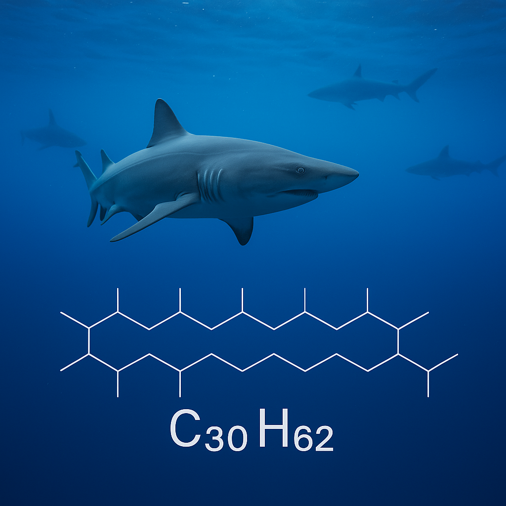 동물성 스쿠알렌은 주로 **심해 상어의 간유(liver oil)**에서 추출됩니다.