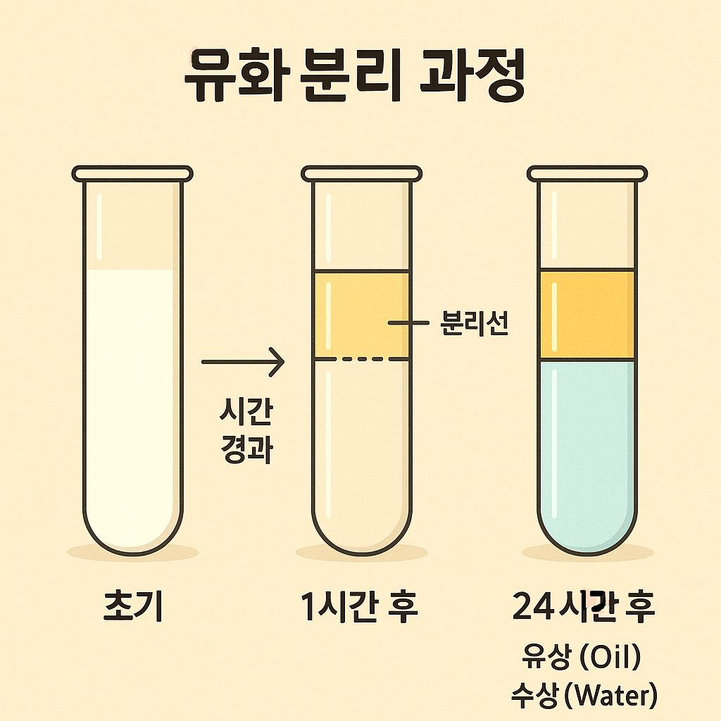 유화(Emulsion)란 원래 **서로 섞이지 않는 두 액체(물 + 기름)**가, 계면활성제의 도움으로 안정된 형태로 섞여 있는 상태를 말합니다.