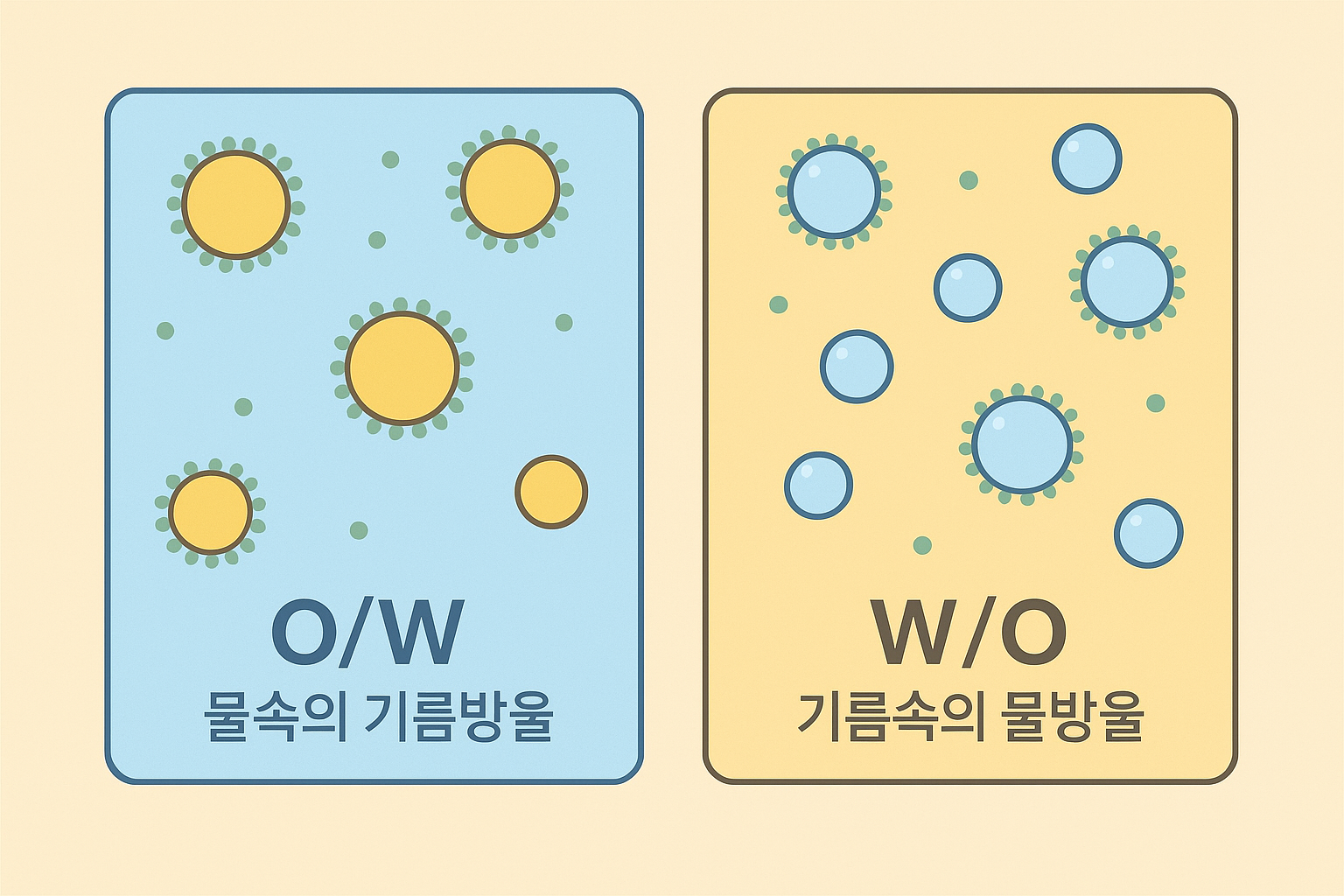 - O/W (Oil in Water): 기름방울이 물 속에 분산된 구조 → 로션, 수분 크림