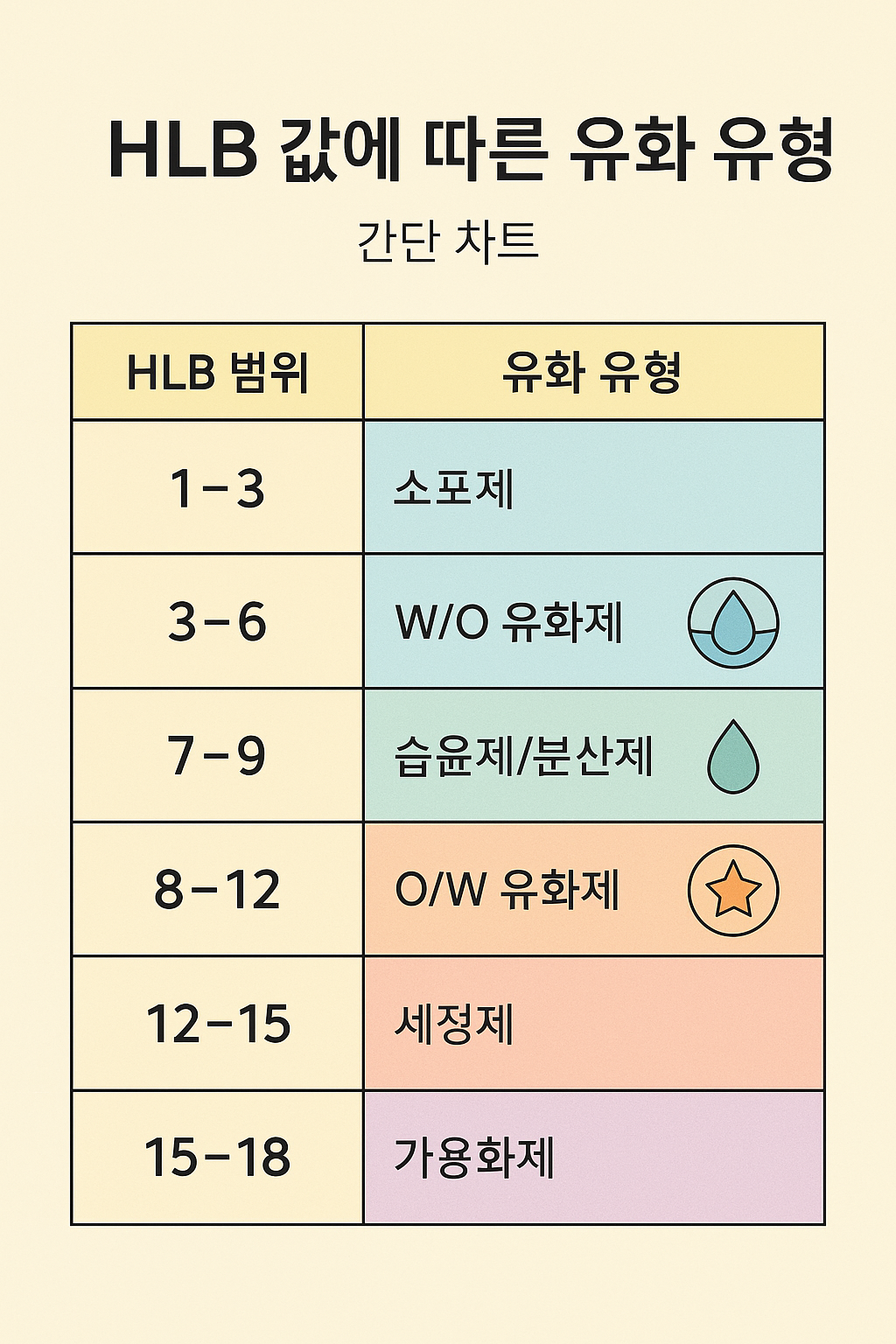 - HLB (Hydrophile-Lipophile Balance) 값으로 물/기름 친화도를 수치화